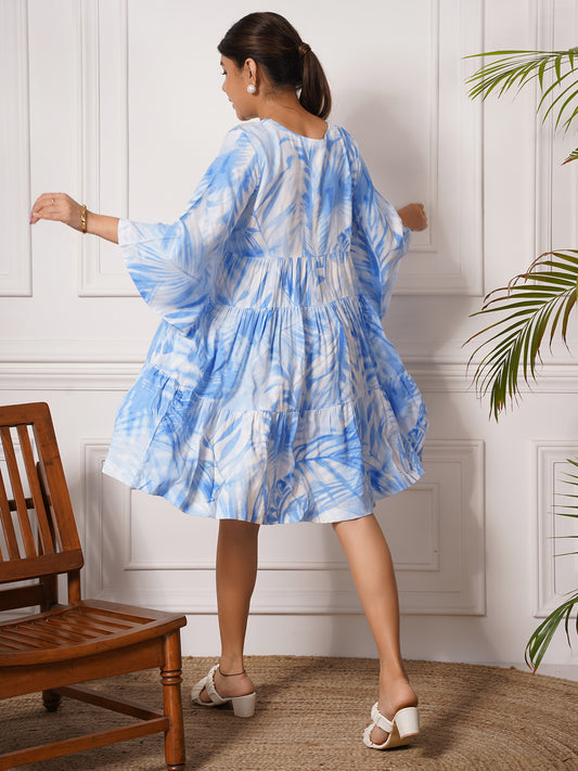 Flared Dress in Arctic Blue Leaf Print